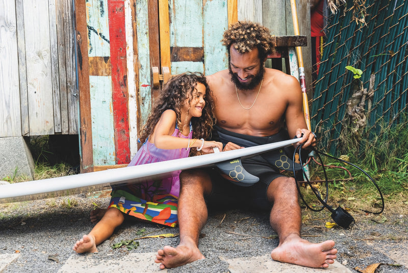Eala and daughter, Marzi waxing boards for winter. Photo Chachi