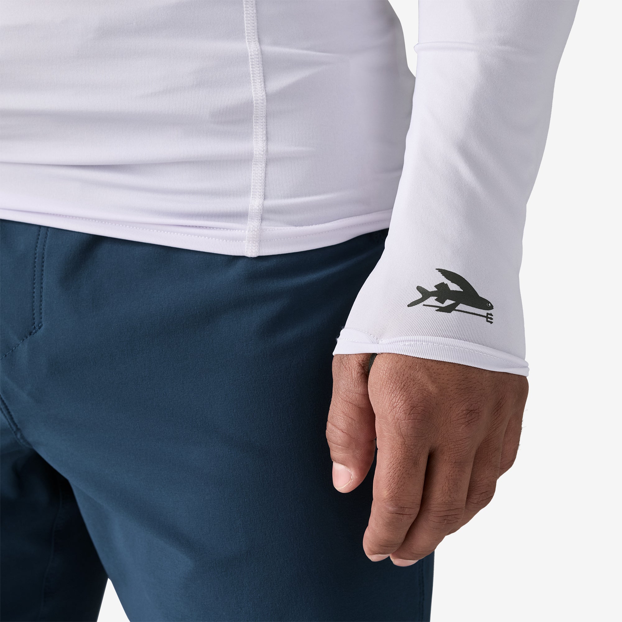 The fabric is made from light and fast-drying 85% recycled polyester/15% spandex jersey with four-way stretch and 40+ UPF sun protection
