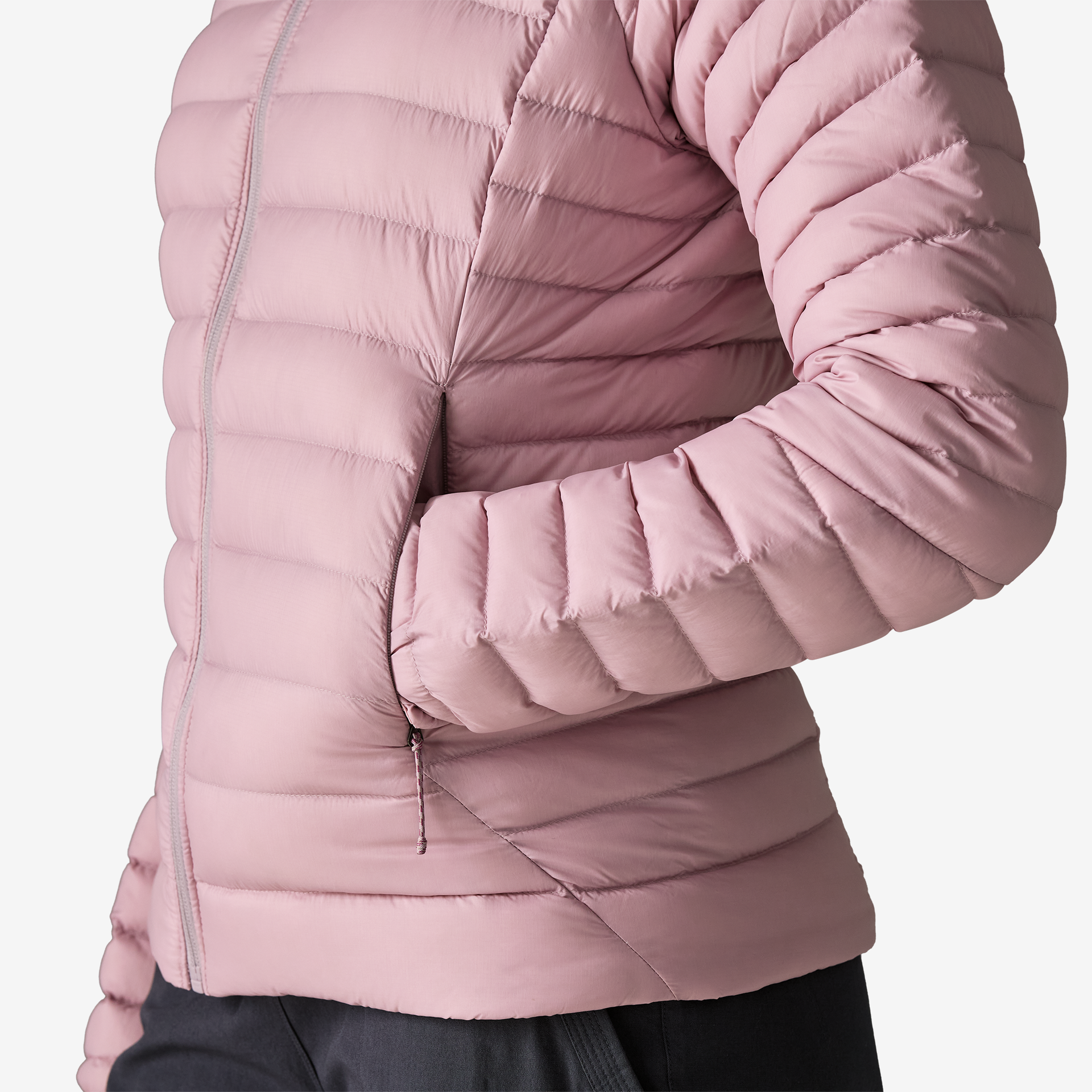 Two on-seam handwarmer pockets have invisible zippers, one interior zippered left-chest pocket converts to a stuffsack with a carabiner clip-in loop